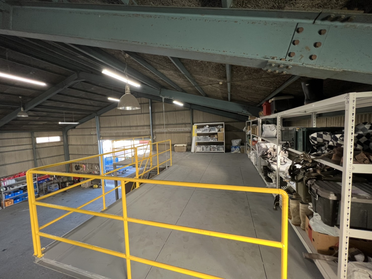 倉庫の中に2階スペースがあり、棚を設置して広く使用できるようになっています。
